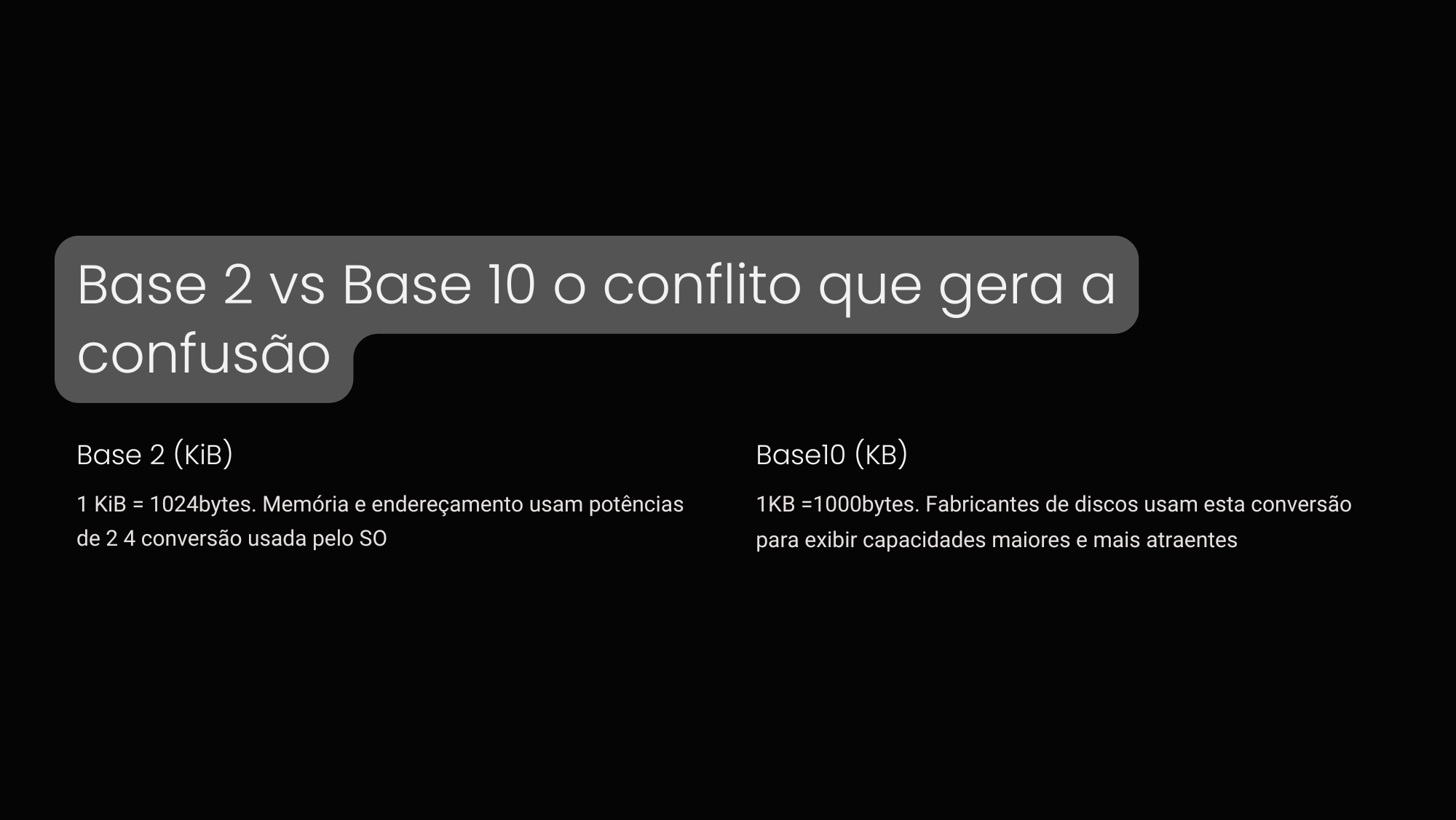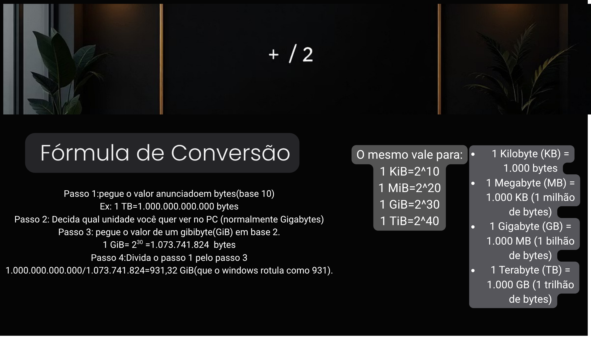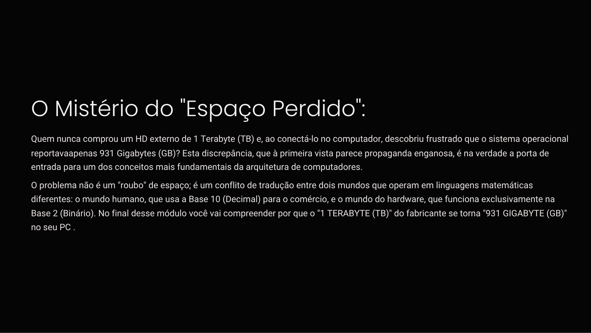 Galera tem um erro no slide que explica como funciona a conversão que o computador usa,no slide ta escrito que 2^30 é igual a: 1.099.511.627.776,porem esse valor esta errado,o valor correto é 1.073.741.824 então desconsidere o valor escrito no slide.Boa aula!