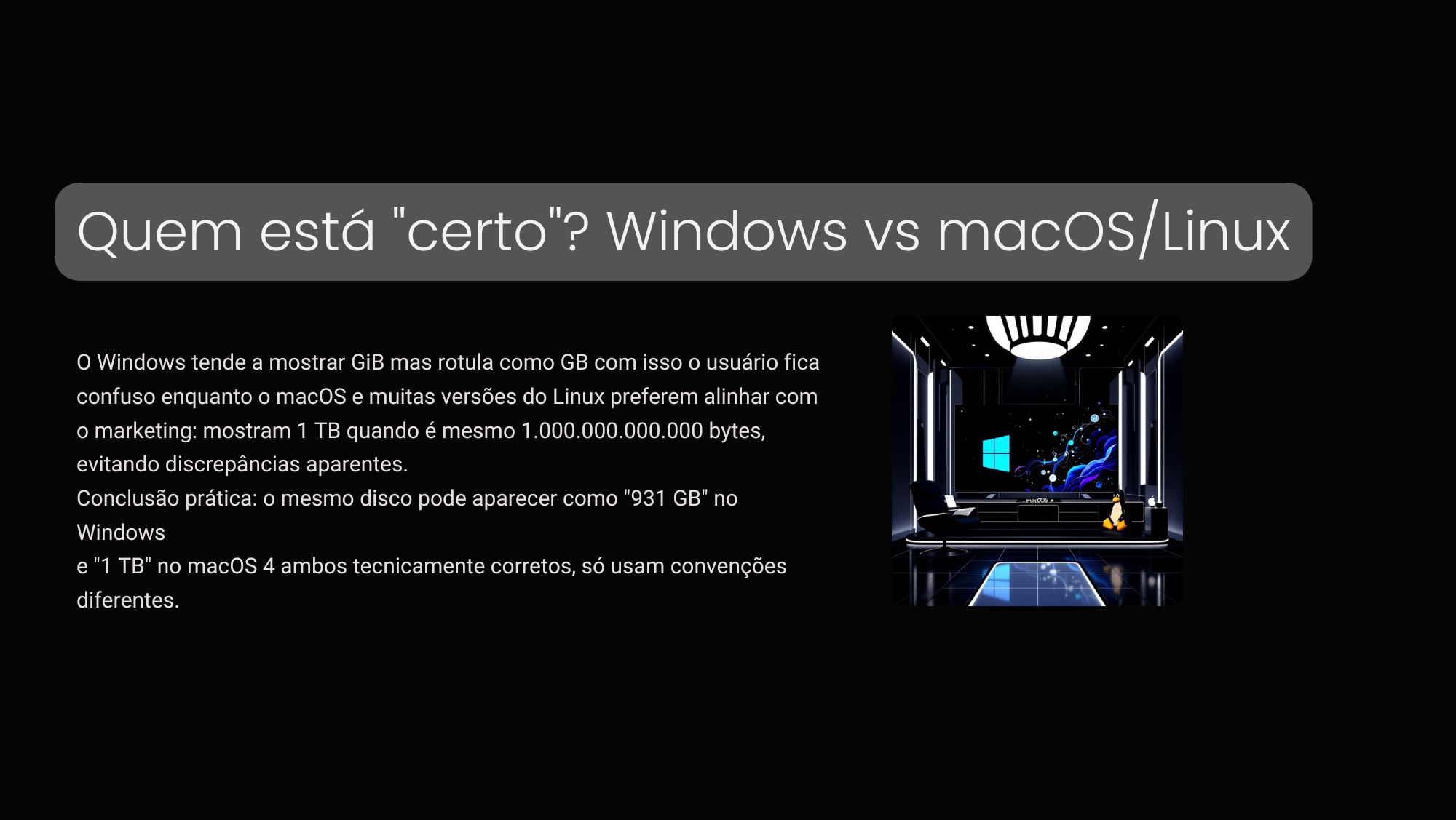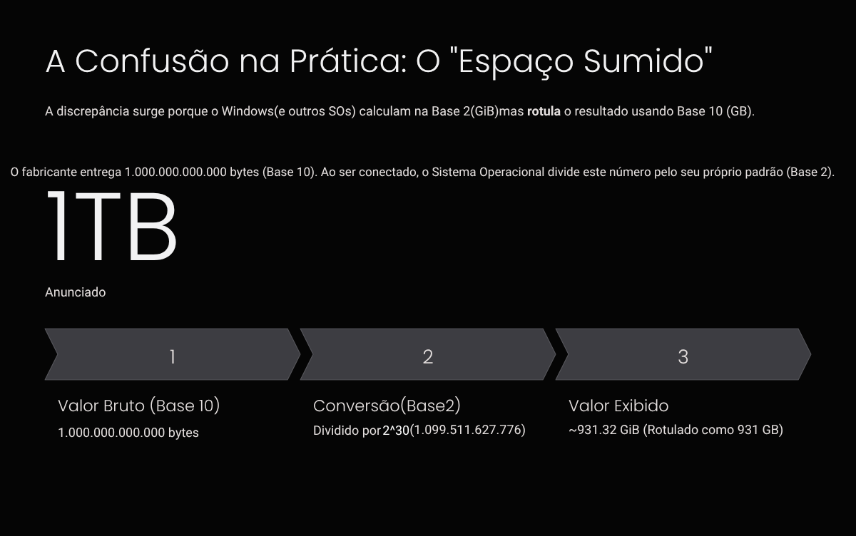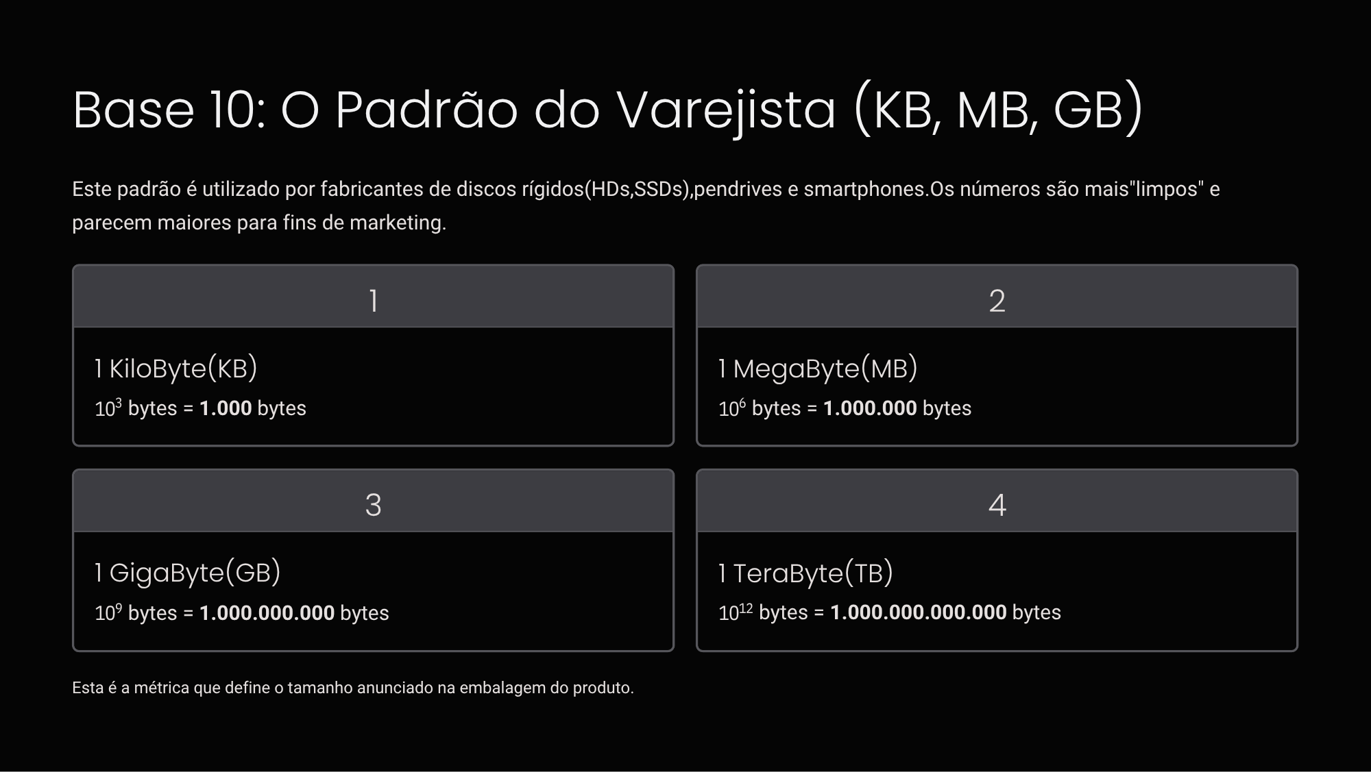 Galera tem um erro no slide que explica como funciona a conversão que o computador usa,no slide ta escrito que 2^30 é igual a: 1.099.511.627.776,porem esse valor esta errado,o valor correto é 1.073.741.824 então desconsidere o valor escrito no slide.Boa aula!