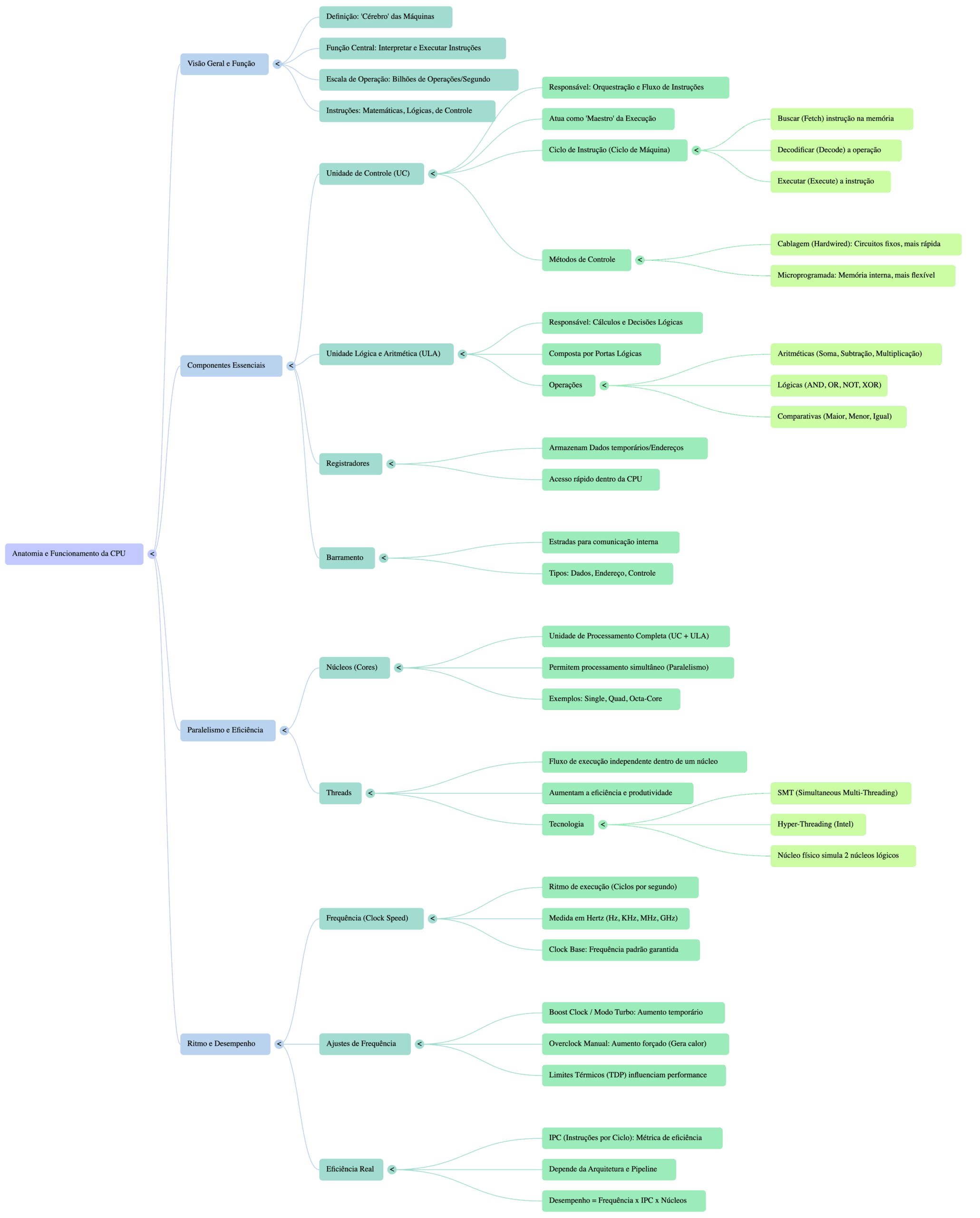 O mapa mental sintetiza a estrutura e o funcionamento da CPU, conectando conceitos fundamentais a aplicações práticas. Ele mostra como o equilíbrio entre arquitetura, paralelismo e frequência determina a capacidade dos processadores modernos de combinar potência, eficiência e inteligência computacional.